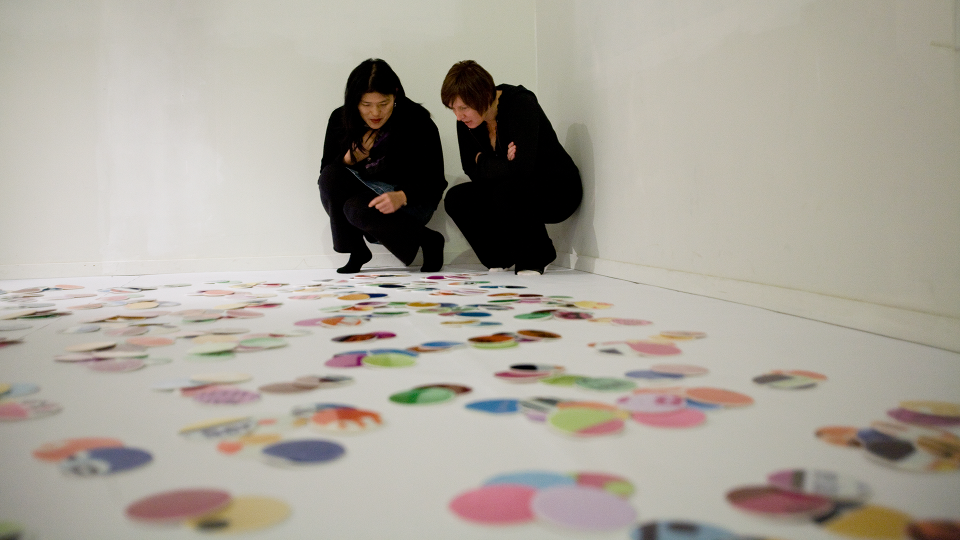 The first installation of Enlarged to Show Detail uses 500 dots (4mm in diameter) punched from Orbit Gum packages enlarged and reprinted to a diameter of 4 inches. The dots are rearranged on the floor based on a computer-generated pattern.